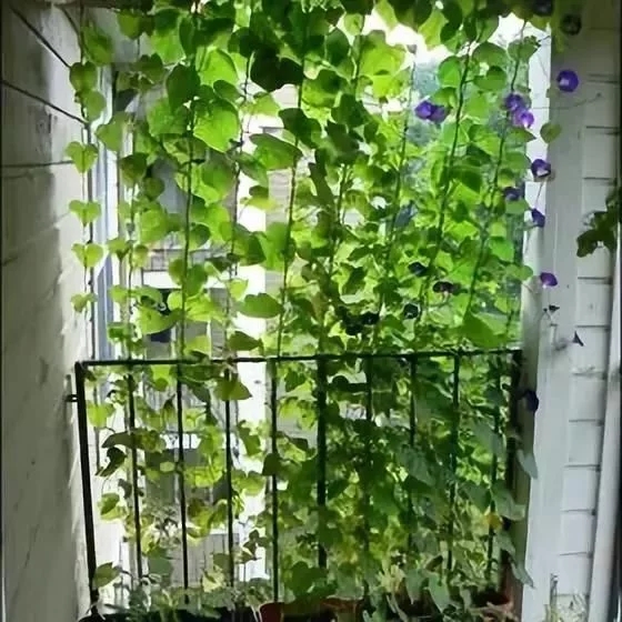 在陽臺的四角立豎桿,上方置橫桿,使其固定形成棚架,或在陽臺的外邊角立豎桿,并在豎桿間縛竿或牽繩,形成類柵欄的樣子,使蔓生植物的枝葉牽引至架上,形成遮陰柵欄或遮陰籬笆,從而形成獨特的立面景觀,如金銀花、蔦蘿、牽牛花、葡萄、紫藤、常春藤等。