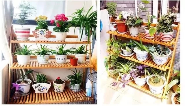 較小的陽臺為了擴大種植面積,常采用花架式進行立體綠化。花架式利用階梯式或其他形式的盆架放置花卉,可在陽臺上進行立體盆花布置,也可將盆架搭出陽臺之外,向戶外要空間,從而加大綠化面積并美化街景。